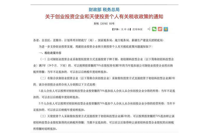 2018年5月,由財(cái)政部、稅務(wù)總局聯(lián)合發(fā)布了《關(guān)于創(chuàng)業(yè)投資企業(yè)和天使投資個(gè)人有關(guān)稅收政策的通知》,又稱“財(cái)稅55號(hào)文”。