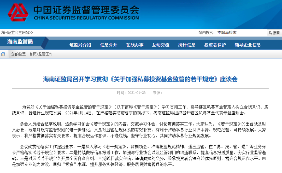 1月26日,海南證監(jiān)局發(fā)布消息稱,已于1月14日組織召開轄區(qū)私募基金代表專題座談會(huì),深入學(xué)習(xí)《規(guī)定》內(nèi)容,下一步將對(duì)照《規(guī)定》開展全面自查自糾。